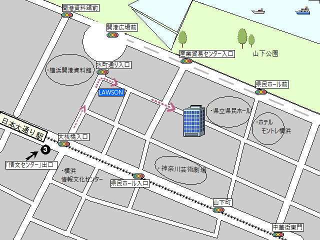 周辺地図 小池順造特許事務所 所在地 〒231-0023 神奈川県横浜市中区山下町24番地8 SOHO STATION 504 TEL:045-228-7578 FAX:045-228-7579 アクセス 東急東横線/みなとみらい線「日本大通り駅」徒歩6分 日本大通り駅 3番「情文センター口」を出て 「大桟橋入口」交差点より大桟橋通りを海へ向かって直進、 水町通り入口を右折し200m直進しますと 右側にSOHO STATION入口がございます。 自動ドアを入り504号室をお呼び出し下さい。